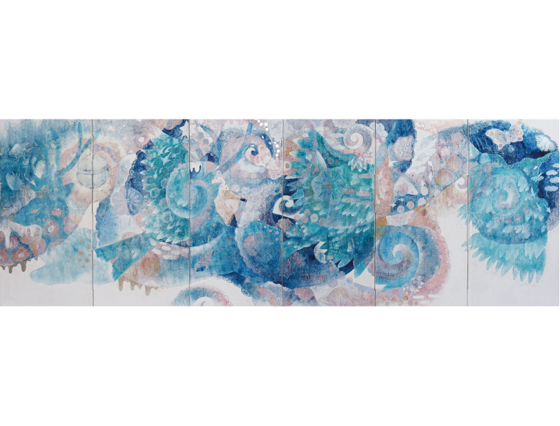 私は「字のない物語を描く」をテーマに、どこで切り取っても絵になる絵を目指して描いています。今回は海の生き物の蛸、陸の生き物の鹿、空の生き物の鳥の3つの生き物をテーマに、複雑に絡み合いながら美しく共存する生命の御祭りを描きました。 屏風自体も1から作っており、木の骨組みに薄い和紙が650枚ほど貼り重ねられて出来ています。私はこの屏風のジグザグの形を利用して斜め左から鳥、正面に蛸、斜め右から鹿という3つの異なる絵が見えるように描きました。 近づいて見てもらえると分かると思いますが、絵の表面にいろいろな凹凸を作っています。それは、それによって出来る光や影などの効果を狙っているためです。 私はまず、盛り胡粉という技法を使い凹凸のある細かい模様を描き、その上から銀箔を貼ってその上に色をつけています。タコの部分には全て銀箔が入っており、見る角度でキラキラと光る銀箔が確認できると思います。また、ゴツゴツザラッとしている部分は貝殻を砕いて作ったオリジナル絵具を使用しています。画面が均一にならない様に、近づいて見たときにも楽しめる様な作りを構成しています。 また、6枚の扇のうち5枚が蛸の足であり、足の螺旋のバランスや気持ちの良い流れを作ること、正面の蛸を見た際に鹿と鳥のモチーフが違和感なく馴染む色彩を作ることに苦労しました。 よく見ると魚やクラゲ、花や蝶など小さな生命も色々隠れています。ぜひ、近づいたり離れたり、右から見たり左から見たり、いろいろな角度で絵を見て絵の中を探索して見てください。