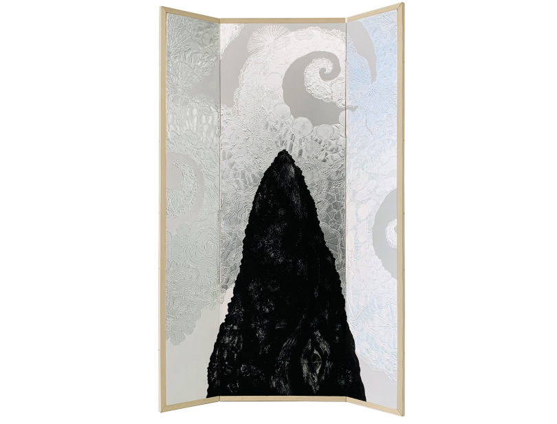 「岩か、島か、よく見たら、鯨」というコンセプトで描いた観音開き屏風です。この屏風も自身で制作したものです。観音開きであることで光の反射効果を狙っています。背景には波の様な風の様な蛸の足のような模様を盛り上げ胡粉と銀箔で表現し、中心には真っ黑なカタマリを配置。岩か島か?などと思いながらよくみると鯨の目に気づきドキッとする、という仕掛けを仕込んでいます。クジラの部分にも模様を描き、⻘墨で着色し、ところどころ洗い落とすことで下の銀箔がキラッとする構成です。大海原でそっと顔を覗かせる鯨の怪し気な雰囲気を楽しんで頂きたいです。