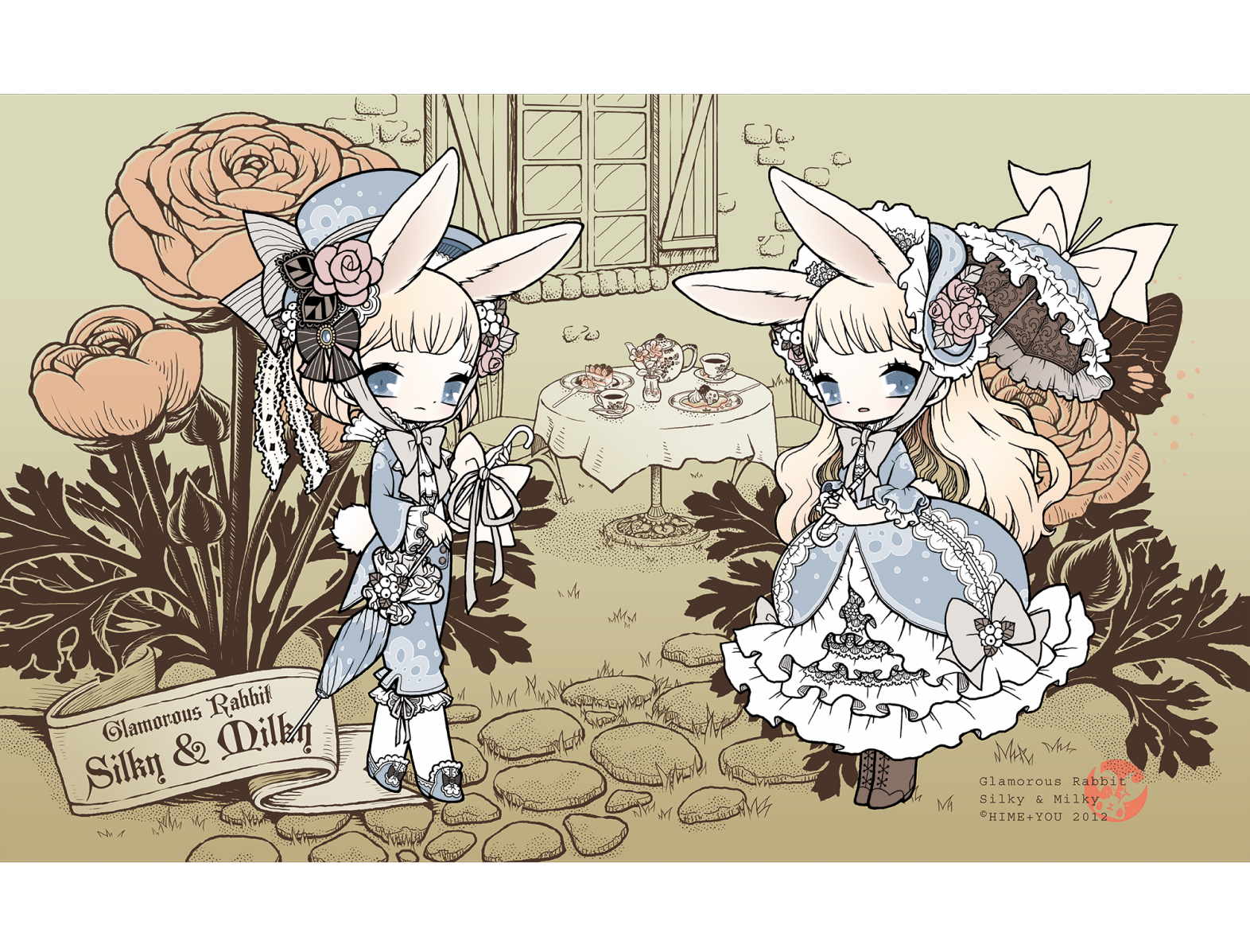 人の姿に似た動物達が生活しているファンタジーな世界。双子兎の妖精です。 デジタルイラスト作品で、Adobe Photoshopを使用。 アナログのミリペンで描いたようなペン先を目指し、調整して描いています。