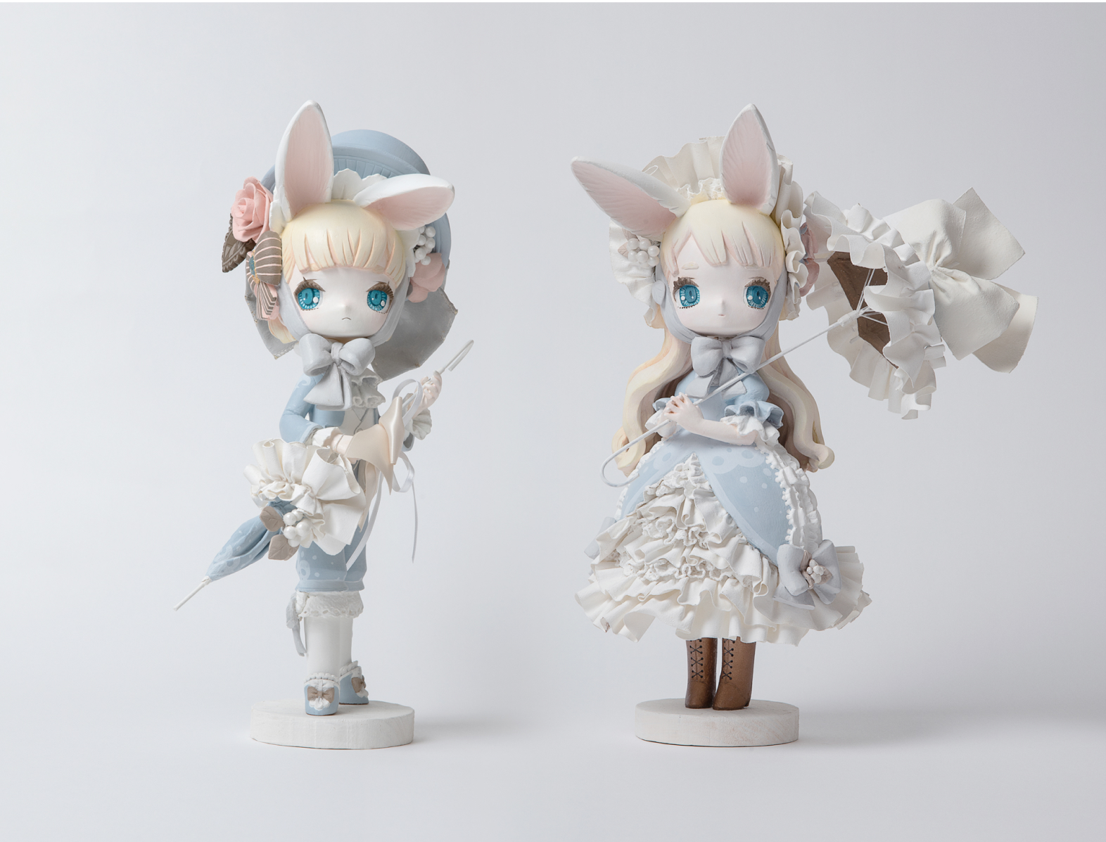 「Silky&Milky」のイラストレーション作品を立体にしました。 素材は石粉粘土の他、針金やジェッソを染み込ませた布を主に使用。アクリルガッシュで着色して仕上げています。