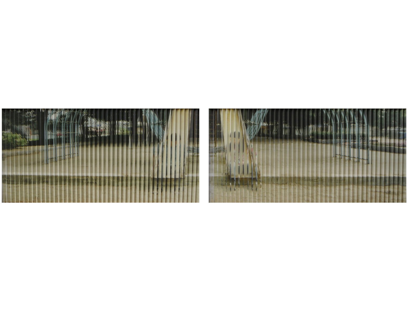 シネマトグラフという技法を使って2枚のイメージを左右で写しわけています。それを正面から視ると同時に平面で見ることもできます。平面の空間に2つのイメージが表れることで、時を加える効果をねらっています。 作品の背景は公園です。公園には友人・恋人・親子といろいろな人が来ます。みんなそれぞれの思いがあって公園にやって来るのだけど、中に入ると共有する同じ価値を持っていると思うのです。“○○ごっこ”というような・・・子供の頃だったら自分が何か違うものになれたりするような変身願望的なものだとか・・・私の中には公園というのはそういう夢の世界なんです。“現実とは違った何かがあるという考え方です”。 引用:Kaleidscopic Gallery Sceneの作家インタビュー記事(2005年)