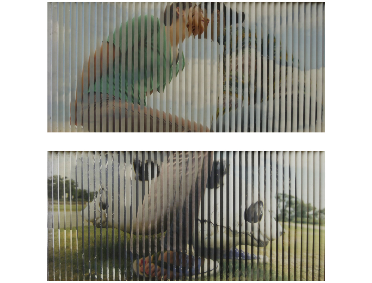 シネマトグラフという技法を使って2枚のイメージを左右で写しわけています。それを正面から視ると同時に平面で見ることもできます。平面の空間に2つのイメージが表れることで、時を加える効果をねらっています。 この二人の関係がどういうものなのかという疑問と、向き合ったパンダがキョトンとしている表情の滑稽さ、この表情が気持ちいい滑稽さに変化すればと思っています。 引用:Kaleidscopic Gallery Sceneの作家インタビュー記事(2005年)