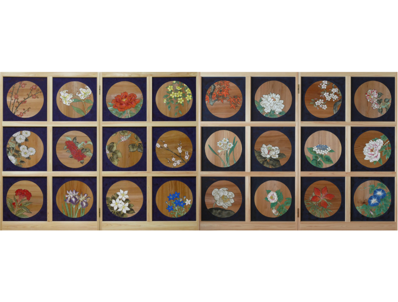 岡山県吉備中央町・円城にある本宮山円城寺の阿弥陀堂天井に設置予定で製作中の天井画を屏風仕立てにしたもの。 天井に組み込んだ折には近くで見ることが出来ない事から、制作途中の一部のみでもと、近くで見ることができるように屏風仕立てにしています。絵を描いている材木は杉、縁はヒノキです。