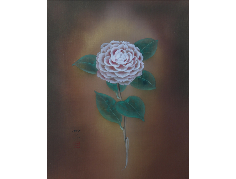 乙女椿を絹に描いた掛け軸です。西洋絵画に見られるような光と影の関係で描いていないことが見ていただくとわかると思います。伝統的な材料のみで描いています。