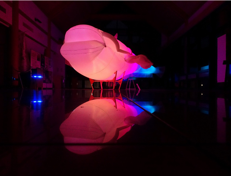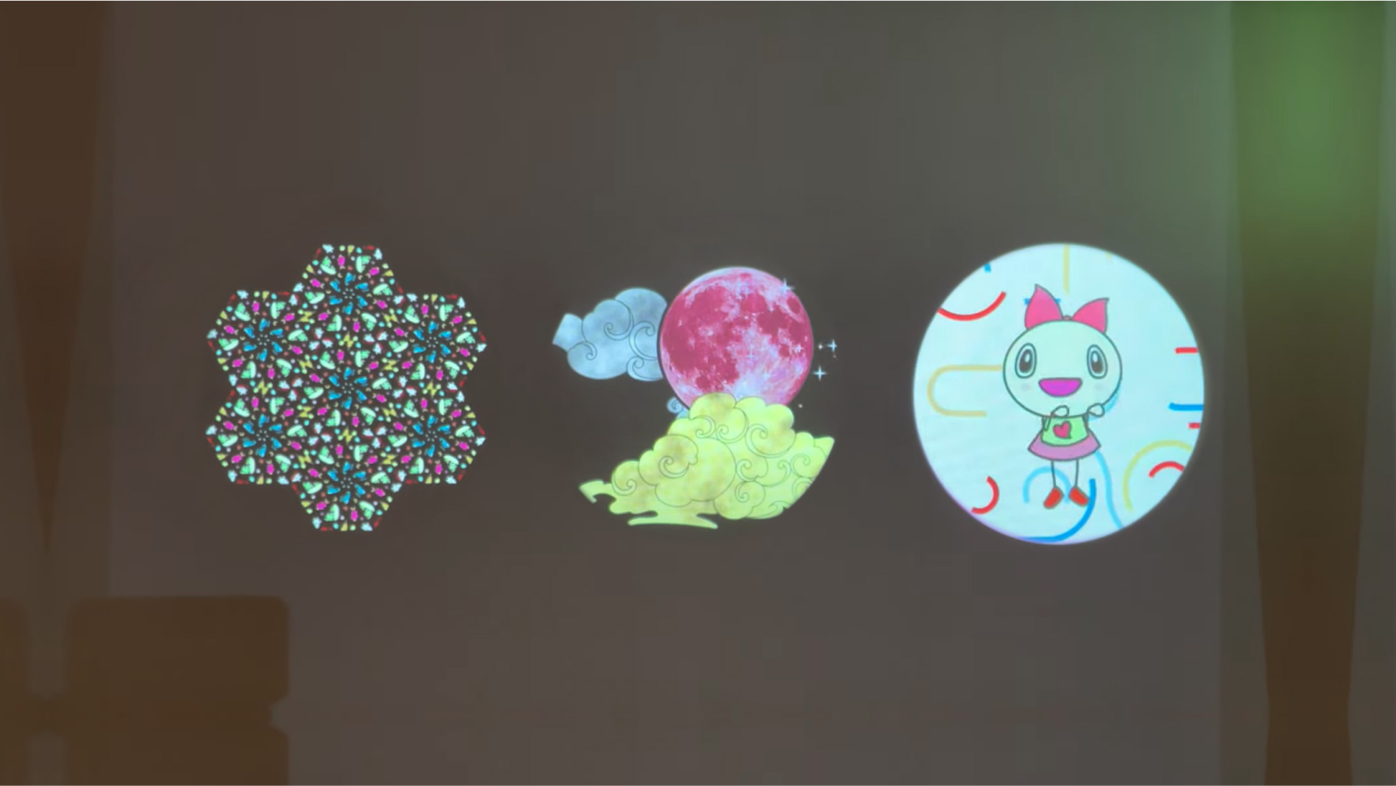 映像インスタレーション「動遊楽アニメ?(Do You Like Anime ? )〜今治市大三島ver〜」。右側からキャラクターアニメーション・モーショングラフィックス・海の生き物モチーフのアニメーションの三本立てになっています。大三島の「三」、大山祇神社の紋の「三」、瀬戸内海の「三」家に分かれた村上水軍と、「三」に縁がある地域性を生かし、「三」をテーマとしています。 そこに「KDM48」というアイドル活動をしている「毛玉星人」や、細胞をモチーフにした「細坊ズ」などのオリジナルキャラクターが登場して、可愛くアニメーションを彩ります。 「パチパチくらげ」は音に反応して動くモーショングラフィックス。手を叩いたり、声を出したりすると、クラゲが踊りだします。「papa paka paka」はパカパカというアルパカの子供キャラクターが同様の仕組みで音に反応して走ります。 アニメーションはもともと静かに鑑賞するものですが、鑑賞者が音を出すことでアニメーションを動かすことができる作品となっています。