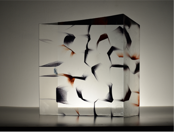 ガラスが溶ける温度は880℃です。 ガラスのパーツを作り、石膏型にいれ、溶かします。窯の中でガラスが溶けて、石膏の隙間に流れ込んでいく様子を想像すると、とてもダイナミックです。 窯に入れる前のガラスの表情と釜から出た後の表情は大きく違います。 今を生きる自分と、これまでの自分を考えた時、同じような違いを感じます。今は以前の形が見えなくても、存在していたことは変わらない事実です。このような想いから「痕跡」というタイトルをつけました。